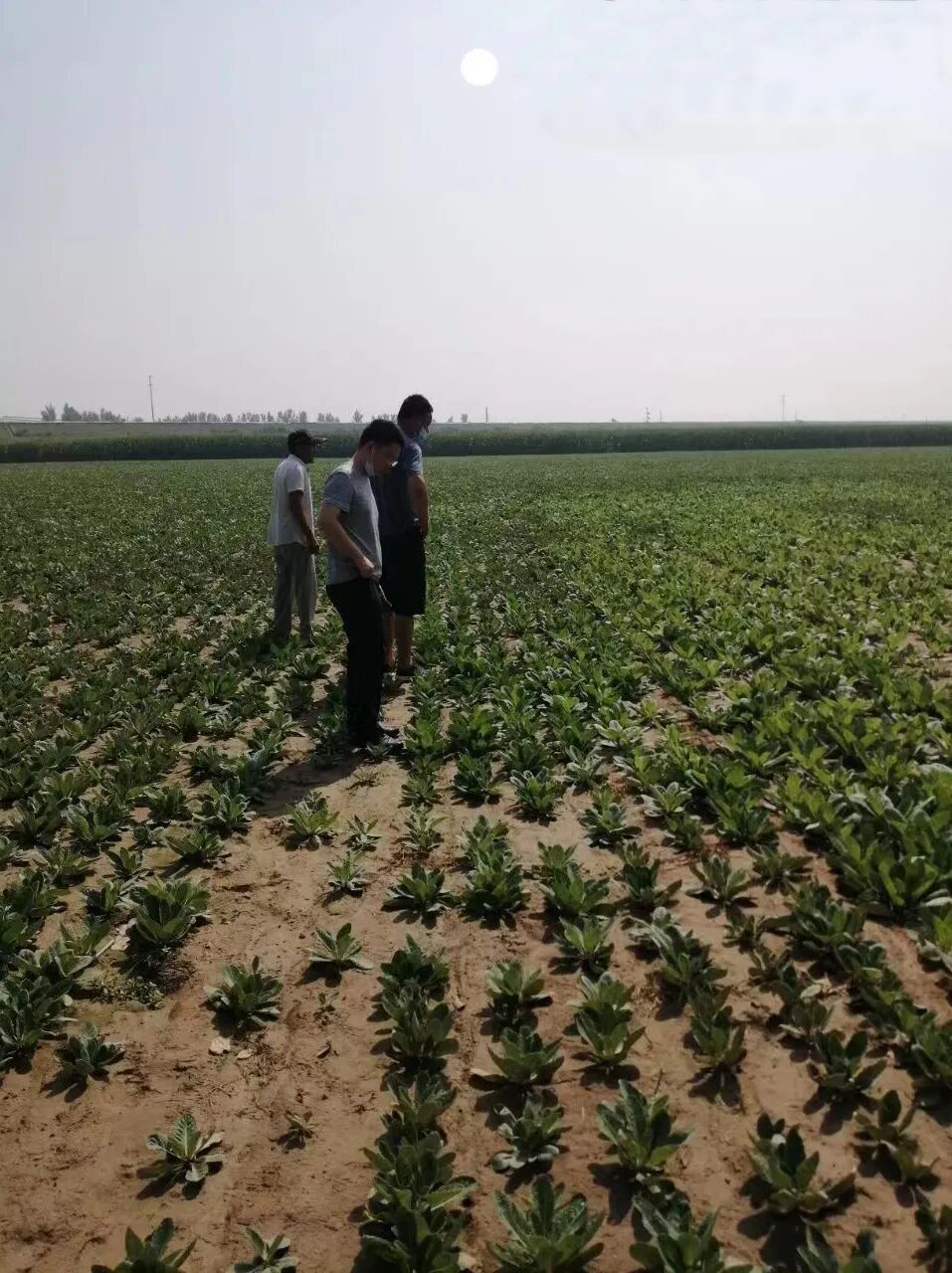 中药材种植公司员工烈日下查看地黄生长情况。