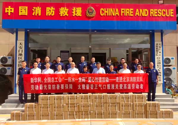 7月5日,国药太极联合全国总工会、新华网走进北京市消防支队,为消防官兵送去藿香正气口服液等防暑解暑物资,以实际行动关爱“高温英雄”。