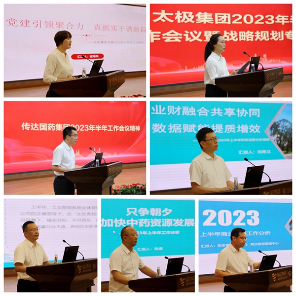 会议传达贯彻了国药集团 2023 年半年度工作会议精神,全面总结了公司 2023 年上半年各项工作,对财务、工业销售、中药材资源、商业流通、党建工作等进行了专项汇报,表彰了太极集团“两优一先”,部署 2023 年下半年重点工作,并根据“十四五”战略规划执行情况及修订思路进行分组研讨和成果分享。