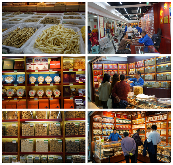 市场内商铺里药材品类众多,陈列整齐