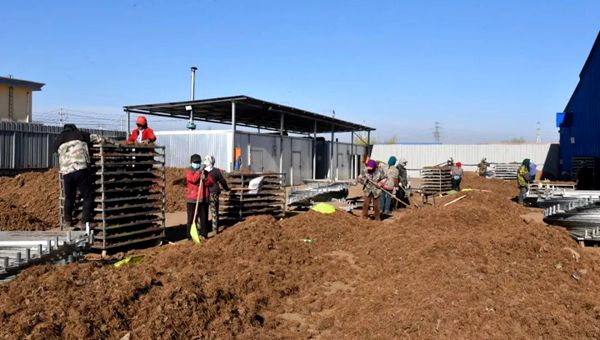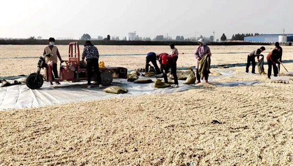 晒场上,工人们正在进行翻晒
