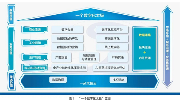 “一个数字化太极”蓝图从中国古代哲学经典《易经》“易有太极,是生两仪”的文化价值观出发,以数字化方式演化出兼顾“阴阳两仪”的双向促进、互动循环模式:外部为阳,即以市场需求为导向,从医药科技研发、药材种植、药品生产到营销和商业流通,贯通中药全产业链;内部为阴,打通集团及成员企业内部运营管理各个环节,形成统筹一体、高效运行的规范治理体系;以数据驱动外部产业链与内部运营管理链融合互动,完成由业务到数据、由数据到业务的阴阳循环,从而打通中药产业化、现代化和国际化的“任督二脉”。