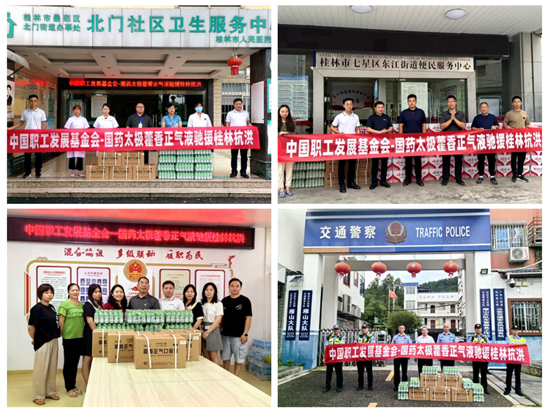 6月以来,广西桂林遭遇自1998年以来最大的洪涝灾害。国药太极联合中国职工发展基金会向桂林市灵川县、叠彩区、七星区捐赠了藿香正气口服液2400盒,藿香小可乐1200瓶。