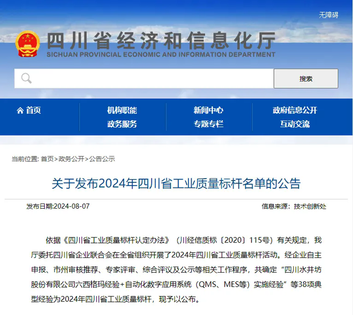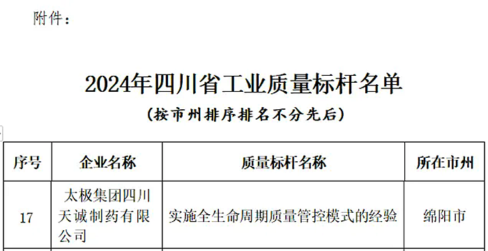 8月7日,2024年四川省工业质量标杆典型经验遴选结果公布,太极集团四川天诚制药有限公司基于实施全生命周期质量管控模式的经验,被评为2024年四川省工业质量标杆。