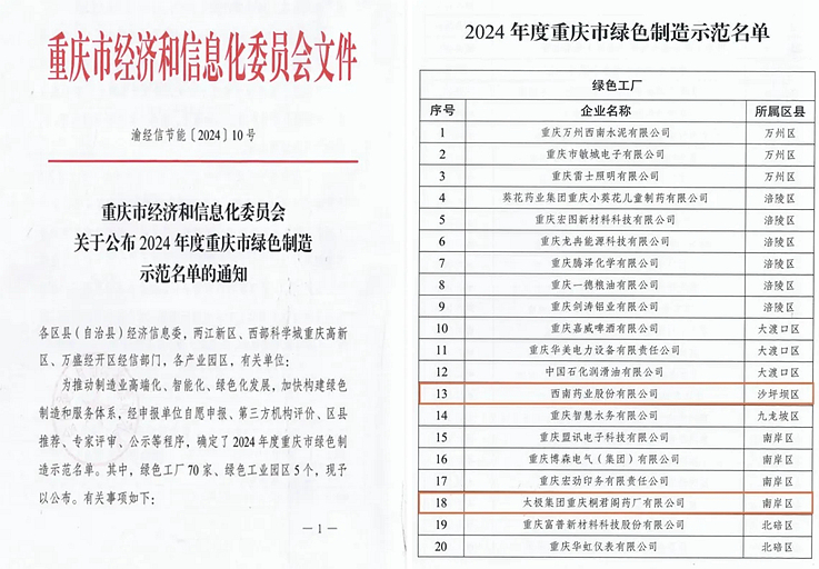 为推动制造业高端化、智能化、绿色化发展,加快构建绿色制造和服务体系,近日,重庆市经济和信息化委员会公布2024年度重庆市绿色制造示范单位名单。国药太极旗下西南药业、桐君阁药厂2家企业入选“绿色工厂”。