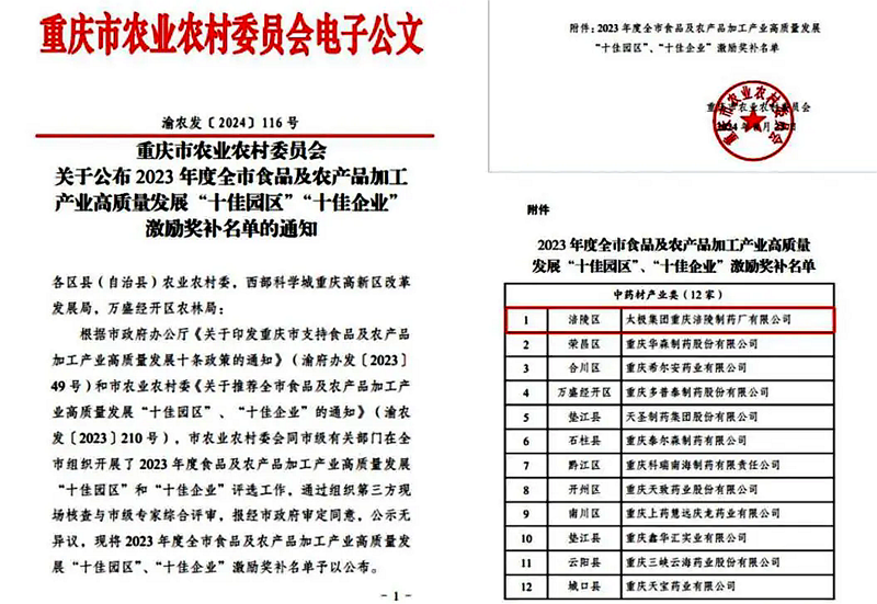 近日,重庆市农业农村委员会公布了2023年度全市食品及农产品加工产业高质量发展“十佳企业”激励奖补名单,国药太极涪陵制药厂成为涪陵区唯一一家中药材产业类企业入选。