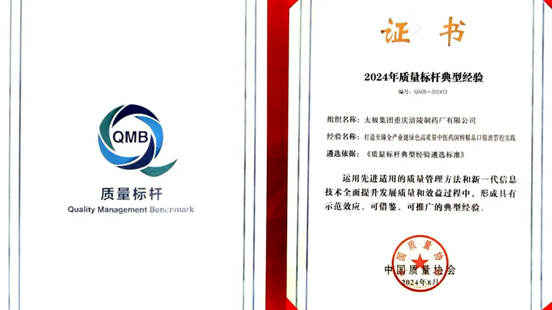 8月29日,中国质量协会“2024年质量标杆典型经验”入选企业在成都正式发布,太极集团重庆涪陵制药厂有限公司(以下称涪陵制药厂)提报的“打造至臻全产业链绿色高质量中医药国粹精品口服液管控实践”入选“产业链供应链质量管控方向”2024年质量标杆。这一殊荣不仅彰显涪陵制药厂在质量管理方面的不懈努力,也体现了坚持绿色可持续发展的匠心精神。